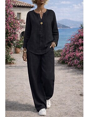 Dámské Košile Dvoudílné sady Imitace bavlny a lnu Plátěné kalhoty Kalhoty Sada Dlouhý rukáv Do V Pevná barva Šňůrky Módní Šik ven Denní nošení Rande Vodní modrá Černá Bílá Jaro Běžný