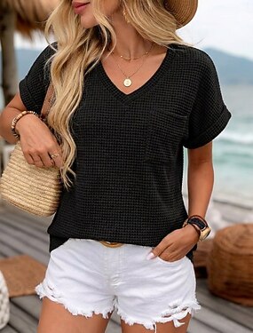 Dámské pletené topy z vaflového vzoru, tričko, klasické tričko, jednobarevné, moderní, ležérní, s krátkým rukávem, kulatý výstřih, běžné tílko, denní, sváteční, na večer, černá, bílá, žlutá, růžová, vínová, léto, jaro