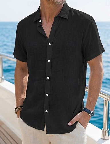 pánská košile z umělého lnu, letní košile, plážová košile, letní havajská košile, jednobarevná, ležérní, denní, modrá, černá, bílá, světle zelená, krátký rukáv, límeček, jaro &léto letní oblečení