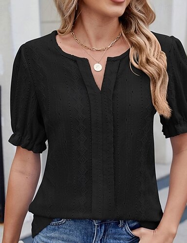 Dámské Texturovaná halenka Očko nahoře Tričko s motivem Pointelle Tričko Poutko Pevná barva Módní Klasické Na běžné nošení Krátký rukáv Do V Běžné topy Ležérní Denní Plážové Černá Bílá Světlá růžov