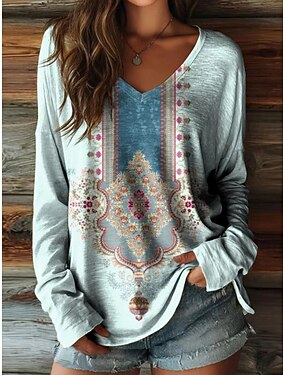 Dámské Boho T-tričko Grafika Geometrická Elegantní Bohemia Vintage Dlouhý Rukáv V Výstřih Pravidelné Top Daily Weekend 3D Tisk Modrá Léto Jaro Podzim Zima