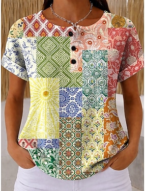 Dámské Halenky s Vaflovým Texturem T Košile Barevný Blok Tisk Grafika Geometrická Stylový Klasický Krátký Rukáv Crew Neck Kulatý Výstřih Henley Běžné Halenky Každodenní Sporty Světle Hnědá Duhová