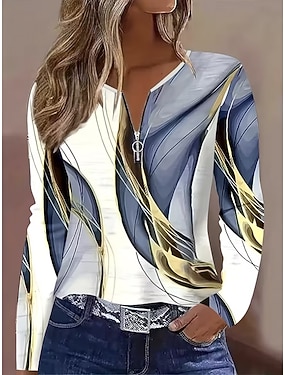 Dámské Tričko Zip Tisk Grafika Geometrický Vinobraní Módní stylové Dlouhý rukáv Tričkový Do V Běžné topy Denní Světle šedá Jaro Podzim Zima