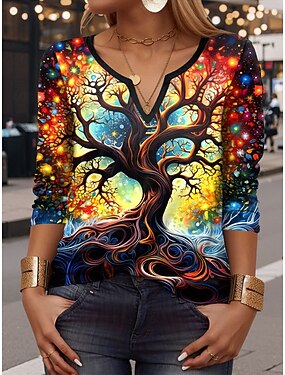 Dámské Tričko Tisk Květinový Grafika Rostliny Elegantní Čechy Vinobraní Dlouhý rukáv Do V Běžné topy Denní Jdeme ven Víkend Vodní modrá Žlutá Světlá růžová Fialová Trávová zelená Jaro Podzim