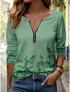 Dámské Tričko Zip Tisk Tónované Květinový Grafika Elegantní Vinobraní stylové Dlouhý rukáv Do V Kulatý Vroubkovaný krk Běžné topy Denní Víkend Travní zelená Jaro Podzim Zima