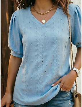 Dámské Texturovaná halenka Očko nahoře Tričko s motivem Pointelle Tričko Pevná barva Módní Klasické Na běžné nošení Krátký rukáv Do V Běžné topy Ležérní Denní Plážové Vodní modrá Černá Bílá Žlut
