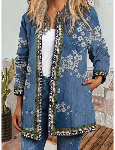 Dámské Neformální bunda Lehká váha Tisk Otevřený vepředu Elegantní Aktivní Vinobraní Módní Geometrický Venkovní Dovolená Párty Práce Dlouhé Výstřih ke krku Běžný Dlouhý rukáv Svrchní oděvy Vodní modrá
