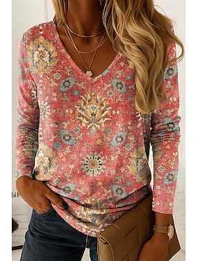 Dámské tričko s dlouhým rukávem V výstřih dlouhá tunika grafika paisley vintage stylové klasické běžné topy každodenní potisk růžová červená modrá fialová zelená jaro podzim předpodzim