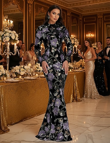 Černé vyšívané květinové Sheath Sloupcové Večerní šaty Elegantní šaty Formální svatba Podlahové délky Dlouhý rukáv Šperkový krk Flitrované s třpytivým rozparkem