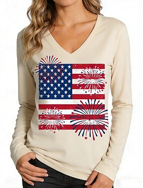 Americký den nezávislosti Dámské Tričko Tričko Top Tisk Květinový Americká vlajka stylové Klasické Na běžné nošení Dlouhý rukáv Do V Běžné topy Denní Jdeme ven Rubínově červená Námořnická modř Khaki