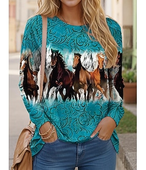 Dámské tričko s dlouhým rukávem kulatý výstřih dlouhý rukáv tunika ležérní potisk koně běžné vršky každodenní modrá jaro podzim předpodzim
