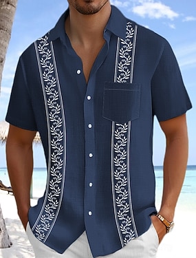 Pánské Lněná košile Košile Guayabera Oblečení na pláž Košile na knoflíky Listy / Stromy Ležérní Plážové Námořnická modř Krátký rukáv Přehnutý Léto Jaro Oblečení