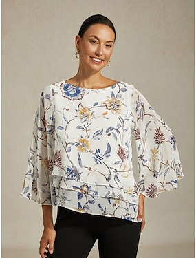 Dámská halenka s květinovým potiskem, vrstvená, zvonové rukávy, volný střih, vrstvená, lehká, krepová, prázdninový styl, ležérní, denní, jaro, léto, podzim