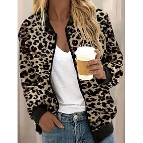 Dámské Letecká bunda Neformální bunda Pohodlné Prodyšné Zip Tisk Na běžné nošení Leopard Dovolená ulice Ležérní Denní nošení Zip Krátké Stojáček Běžný Dlouhý rukáv Svrchní oděvy Černá Bílá Světl