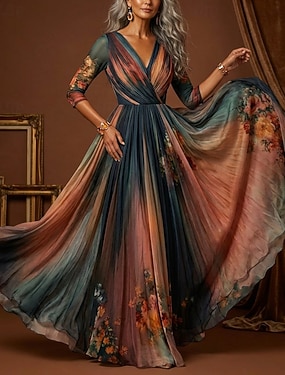 Dámské dlouhé šaty maxi šaty ležérní šaty swingové šaty květinové šaty letní šaty boho šaty vintage prázdninové denní prázdninové šaty regular střih květinový dlouhý rukáv výstřih do V modré letní