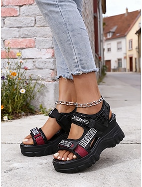 Dámské černé sportovní sandály na platformě s kamínky - výrazný design pásků s nastavitelným suchým zipem, ideální na chůzi, turistiku a běžné nošení