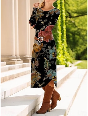 Dámské Midi šaty Tričkové šaty Áčkové šaty prázdniny Na běžné nošení Cikánský Denní Dovolená Rande Běžný Květinový Grafika Geometrický Dlouhý rukáv Do V Vodní modrá Tmavěhnědá Bílá Rusty Red Podzim