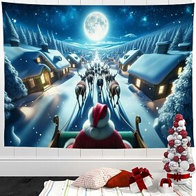 Vánoční gobelín se sněhovým domkem – nástěnná dekorace do zimní říše divů, slavnostní vánoční dekorace do ložnice a obývacího pokoje