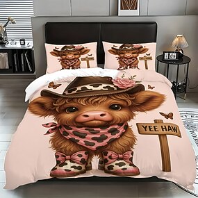 Roztomilý květinový 3dílný péřový povlak na peřinu s motivem skotské krávy na velkou postel, měkký krátký plyšový povlak na přikrývku se 2 povlaky na polštáře – ložní prádlo do hotelové ložnice,