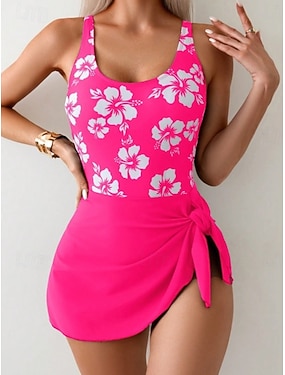 Dámské Plavky Jeden kus 2 ks Monokini Sukně Plavky Zaštíhlující Vysoký pas Štíhlý Volná záda Elegantní prázdniny Květinový Růže Asymetrický krk Bez rukávů Plavky