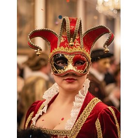 Dámská barokní komická veneziánská maske - červená a zlatá sametová karnevalová kostýmová doplňková věc pro festival v Benátkách Mardi Gras a maškarní večírky