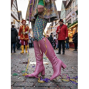 Dámské růžové třpytivé vysoké boty po kolena s blokovými podpatky – Jiskřivé odvážné módní prohlášení ideální na karneval festivaly a kostýmové párty