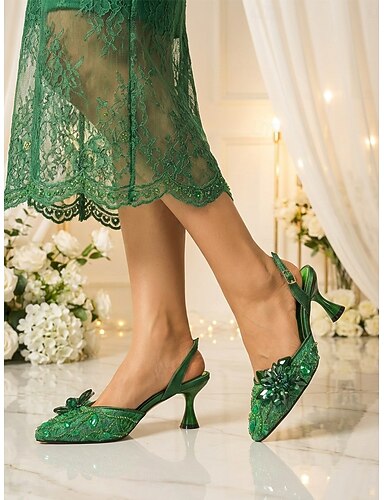 Dámské zelené zdobené boty s lodičkami s úzkou špičkou a květinovým vzorem s krystaly na koktejlové večírky a večerní akce &večer s prohlášením