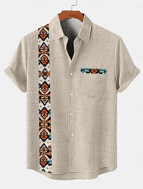 Pánské Geleneksel Lněná košile Letní košile Krátký rukáv Na běžné nošení Africký vzor Dovolená Denní Léto Jaro Stojáčkový límec Tisk Vodní modrá Khaki Šedá