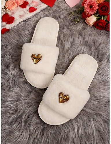 Dámské khaki nadýchané domácí pantofle z umělé kožešiny se zlatým přívěskem ve tvaru srdce – měkké plyšové pantofle s otevřenou špičkou do ložnice, do lázní a jako dárek k Valentýnu