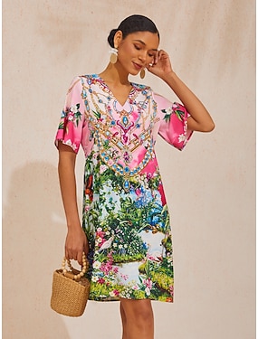 volné minišaty s květinovým potiskem a výstřihem do V