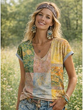 Dámské Tričko Tisk Květinový Grafika Vinobraní stylové Klasické Krátký rukáv Do V Běžné topy Ležérní Denní Jdeme ven Vodní modrá Žlutá Rubínově červená Fialová Oranžová Léto Jaro