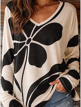 Dámské Tričko Tisk Květinový Grafika Rostliny stylové Klasické Dlouhý rukáv Do V Běžné topy Denní Jdeme ven Víkend Černá Bílá Jaro Podzim