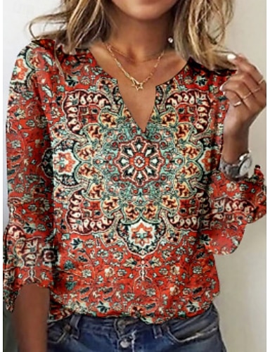 Dámské Tričko Tričko Top Tisk Květinový Grafika Čechy Vinobraní Dlouhý rukáv Do V Běžné topy Denní Jdeme ven Víkend Vodní modrá Žlutá Fialová Fuchsiová Khaki Léto Jaro