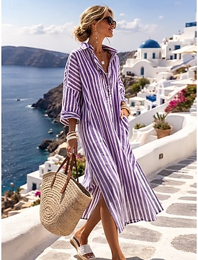 Dámské maxi šaty z imitace bavlny a lnu, košilové šaty, kaftanové šaty, ležérní šaty, stylové, ležérní, denní, dovolená, rande, regular střih, proužky, dlouhý rukáv, klopa, žlutá, světle zelená, červená, královská modrá, léto