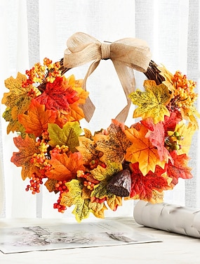 podzimní věnec na přední dveře, den díkůvzdání, podzimní sklizeň, dekorace do interiéru a exteriéru, dýňový a javorový list, umělý věnec z vinné révy, halloweenská bytová dekorace