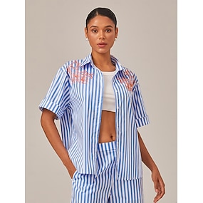 Dámské Žena Košile s knoflíkem Košile pro volný čas Strom Proužky Ležérní Trička Vodní modrá Výšivka Knoflíky Krátký rukáv Elegantní prázdniny Na běžné nošení Košilový límec Léto