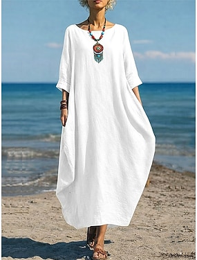 Dámské maxi šaty z bavlny a lnu volné šaty běžné denní standardní střih jednoduše 3/4 rukáv kulatý výstřih modrá bílá červená tmavě zelená léto jaro podzim
