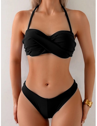Dámské bikiny 2 dílný plavky řasené podprsenkové kalhotky slim bez zadního dílu dovolená plážové oblečení jednobarevný V výstřih bez rukávů plavky