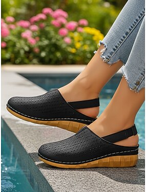 Dámské béžové pantofle na blokovém podpatku – perforovaný výřez s uzavřenou špičkou, pohodlné pantofle na zahradu, volnočasové &denní nošení