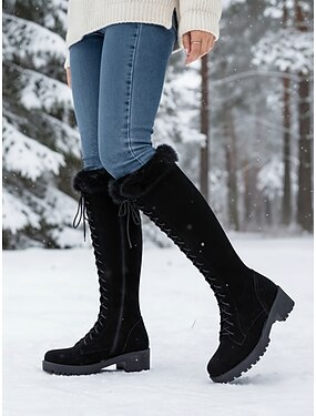 dámské šněrovací boty po kolena z umělého semiše s manžetami z umělé kožešiny – stylová zimní obuv s robustní podrážkou