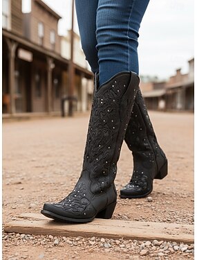 dámské vintage westernové kovbojské boty zdobené drahokamy, vyšívaný kožený design pro svatby a zvláštní příležitosti