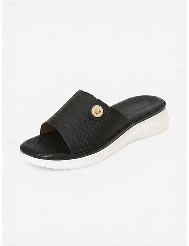 Dámské černé pantofle se zlatým kovovým dekorem - sandály na platformě s dřevěnou texturou pro luxusní lenošení u bazénu, hotelové resorty &letní prázdniny