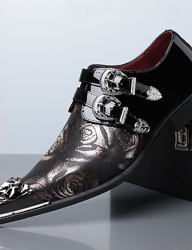 Pánské černé společenské boty s dvojitým páskem, květinovým reliéfním svrškem a kovovou špičkou, luxusní společenské boty pro stylové muže, ideální na svatby, bankety, večírky a výrazné večerní nošení.