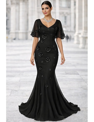 Mořská panna Na zem Večerní šaty Formální šaty Elegantní Květinový Krátký rukáv Do V Svatební Formální Šifón s Vyšívaná květina Sklady