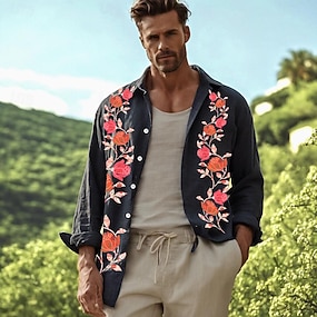 Pánské Košile Letní košile Košile pro volný čas Plážová košile Westernová košile Košile na knoflíky Černá Námořnická modř Khaki Dlouhý rukáv Pevná barva Květiny Klopa Dovolená Ležérní Výšivka Oblečení
