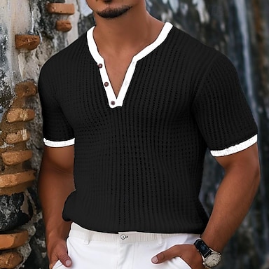 Pánské Waffle Henley košile Vaflové pletené tričko Tričko Top Krátký rukáv Pevná barva Módní Designové Pohodlné Knoflíky Pletený Do V Henley Venkovní Ležérní Denní Léto Černá Bílá Námořnická modř