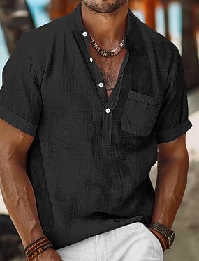 Pánské Košile Lněná košile Košile pro volný čas Košile na knoflíky Bavlněná košile Bez vzoru Dovolená ulice Černá Bílá Námořnická modř Khaki Krátký rukáv límec dědečka Léto Oblečení Tlačítko dolů