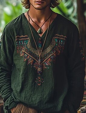 Pánské Košile Lněná košile Vikingský styl Popover košile Letní košile Oblečení na pláž Geometrický Dovolená ulice Trávová zelená Dlouhý rukáv Do V Léto Jaro Oblečení