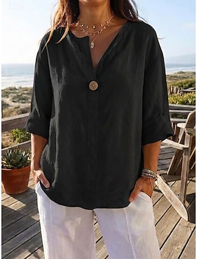 Dámské Mieszanka bawełny Halenka Knoflíky Bez vzoru Základní Moderní 3/4 délka rukávu Do V Běžné topy Denní Dovolená Jdeme ven Černá Bílá Světlá růžová Hnědá Meruňková Léto