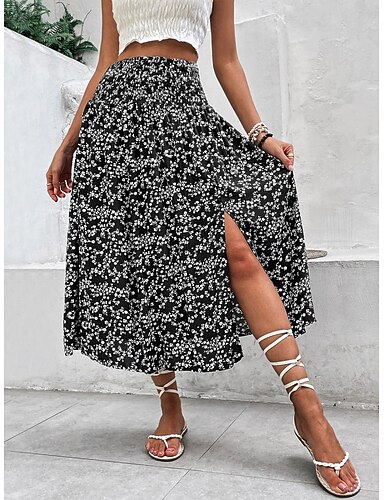 Dámské Dovolená sukně Módní Na běžné nošení Midi Vysoký pas Sukně Květinový Tisk Rozdělené konce Lehce elastické Denní ulice Černá Námořnická modř Trávová zelená Léto Polyester